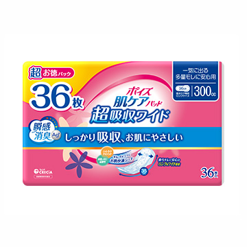 - 長さ35cmのロング&ワイド形状で、後ろモレにも安心の「ポイズ 肌ケアパッド 超吸収ワイド(女性用)」からまとめ買いのニーズに対応した36枚入りの超お徳パックをラインアップ追加しました。